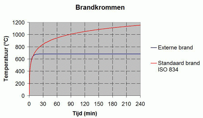 Deze curve geeft de wereldwijd geaccepteerde temperatuurstijging weer in een brandtestoven tijdens een brandproef. Het kenmerk van de curve is dat er in de eerste 10 minuten een zeer snelle temperatuurstijging ontstaat waarna de curve afvlakt en veel meer lineair blijft doorstijgen. Hierdoor neemt de temperatuur wel constant toe tijdens de test en kunnen we dus ook stellen dat, hoe langer het brandt, hoe warmer het wordt. Een 30 minuten test heeft een eindtemperatuur van ongeveer 8250C, terwijl een 60 minuten test 9500C aantikt en 90 minuten zelfs hoger dan 1000 graden eindigt.